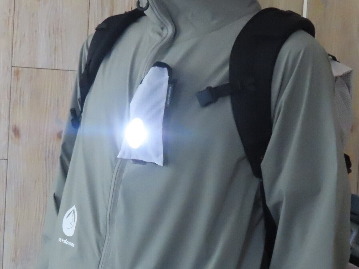 胸元のマジックテープには別売りのライト入れが装着可能。